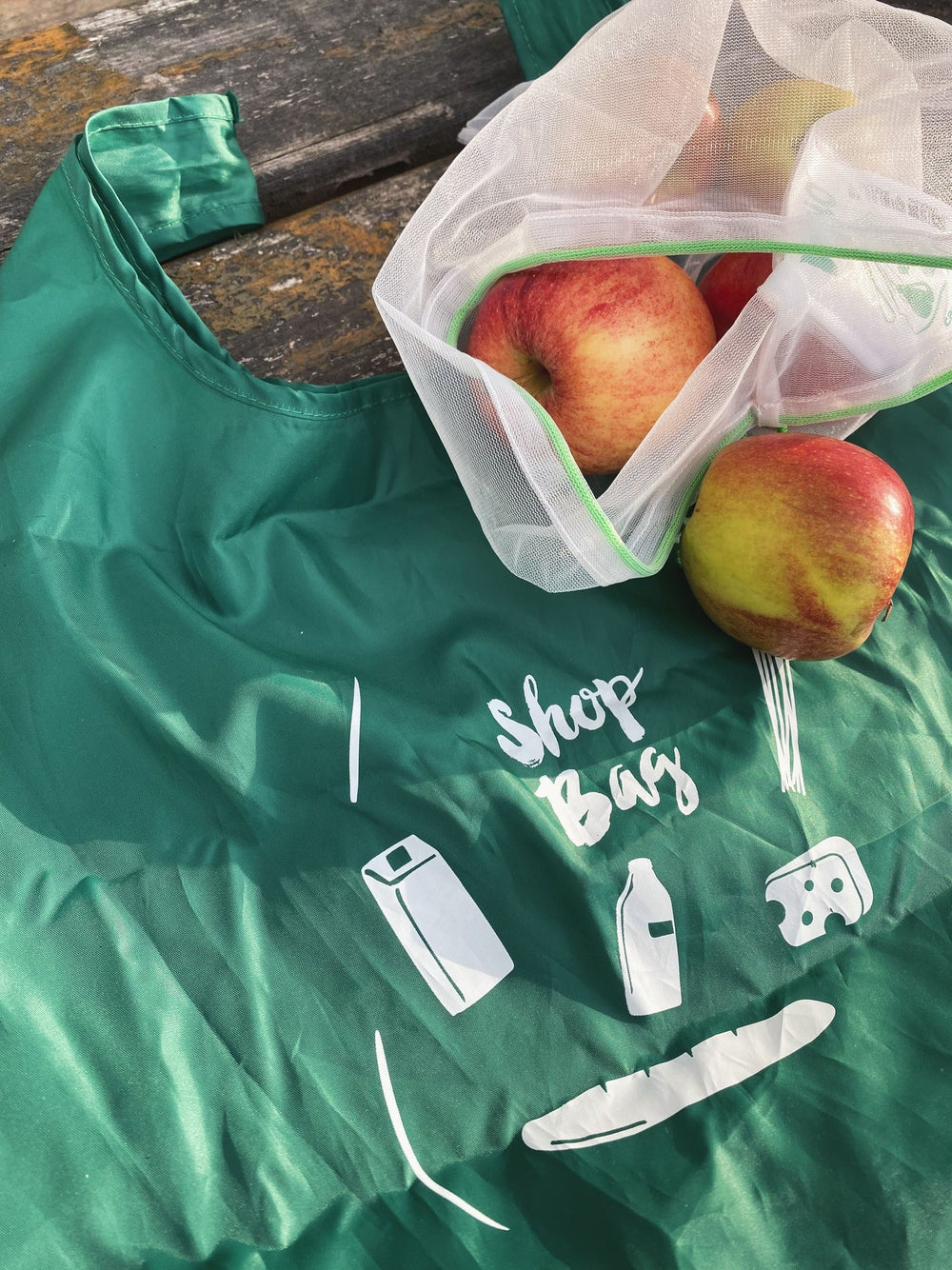 Upptäck våra populära Shop Sets som innehåller återanvändningsbara shoppingkassar och Veggio nätpåsar i polyester.